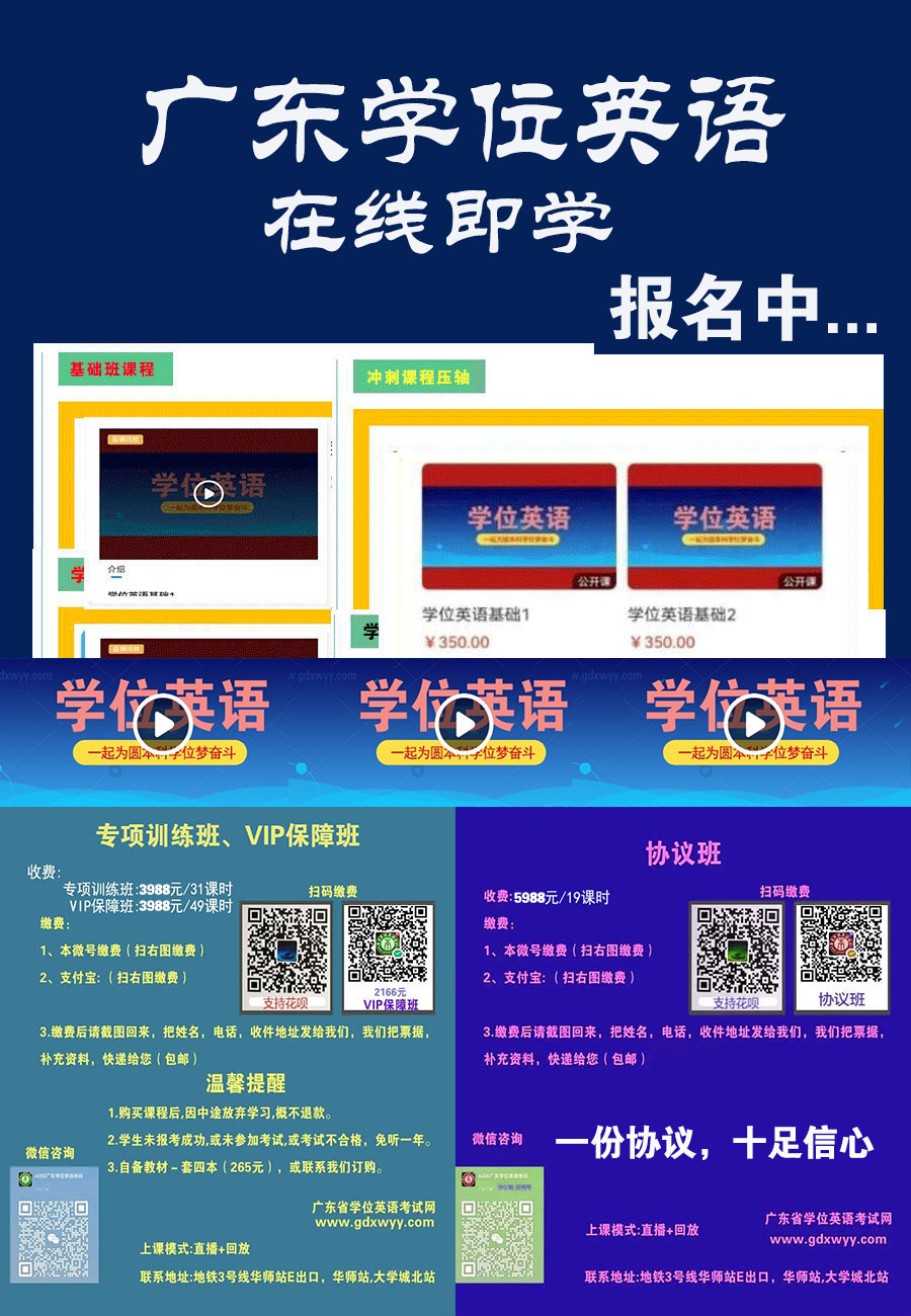 2026年广东学位英语,为响应广东省联盟学位英语考试,近期考生咨询较多,因基础不强,词汇量掌握不够,是否有保过之类;目前综合考生问题,《协议班》已上线,价格5980元。欢迎提前参加课程,提早打好基础,顺利通关。咨询加微信:gdxwyycom,请备注咨询内容,如协议班...
