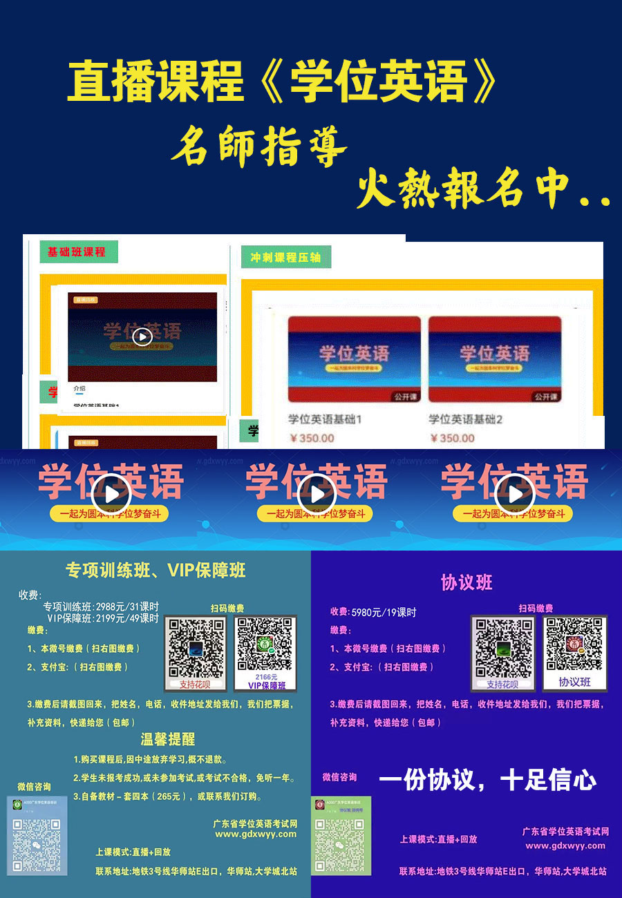 2026年广东学位英语,为响应广东省联盟学位英语考试,近期考生咨询较多,因基础不强,词汇量掌握不够,是否有保过之类;目前综合考生问题,《协议班》已上线,价格5980元。欢迎提前参加课程,提早打好基础,顺利通关。咨询加微信:gdxwyycom,请备注咨询内容,如协议班...